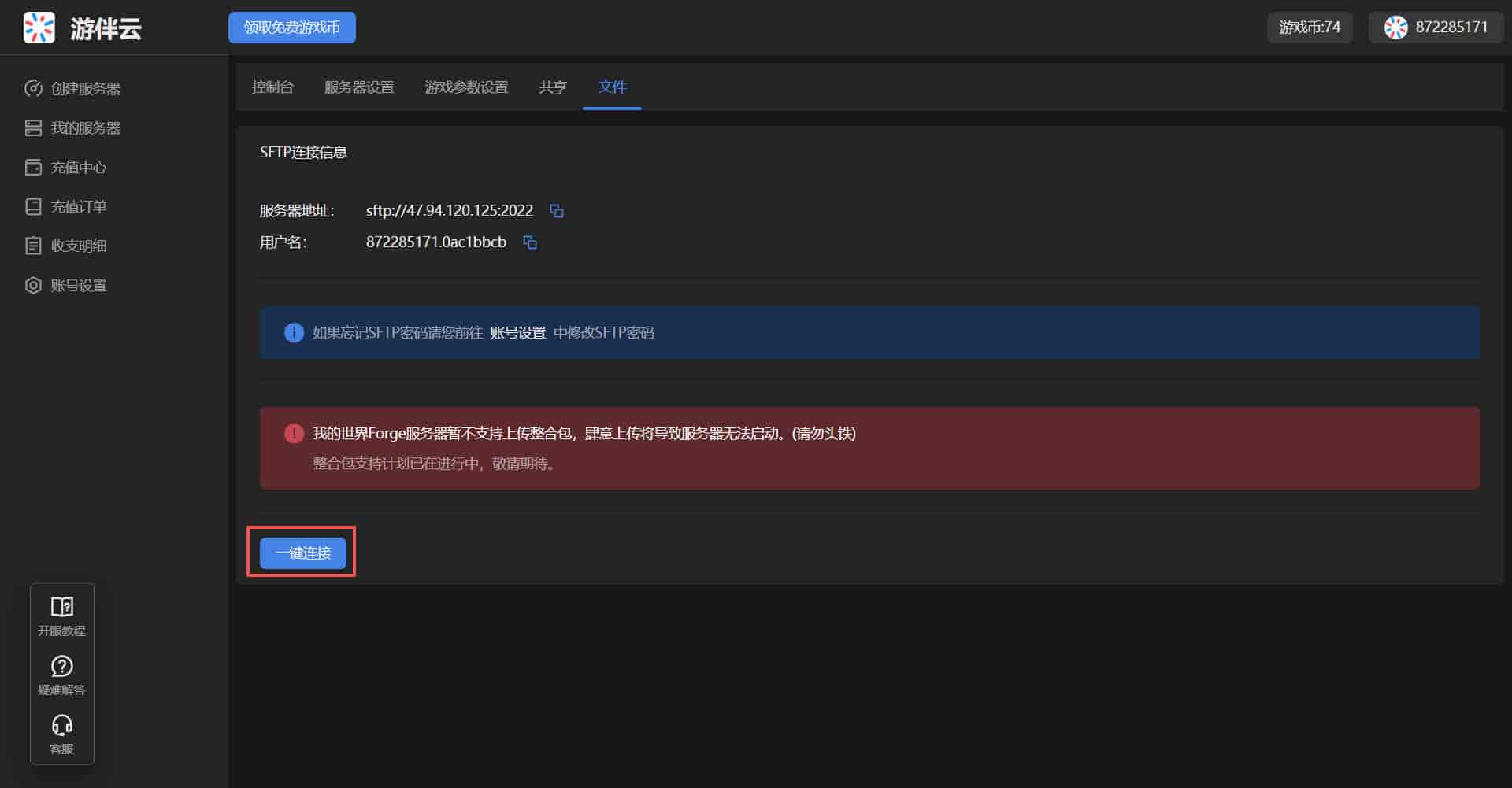 点击服务器右上角的