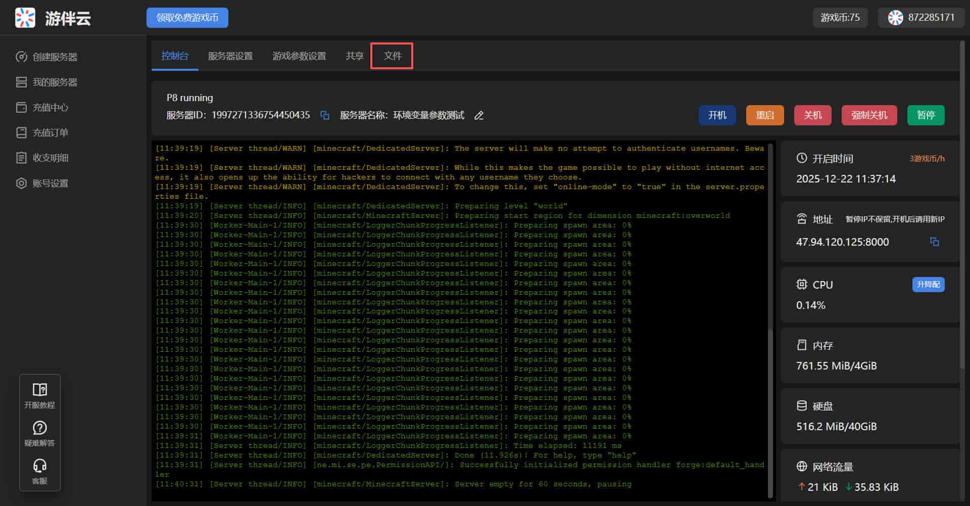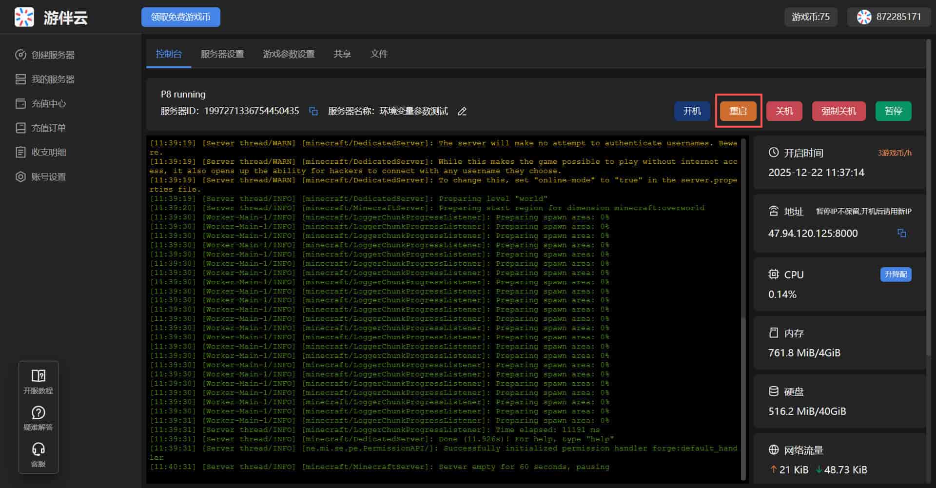 - 返回服务器控制台,点击 重启 按钮,等待服务器重启完成