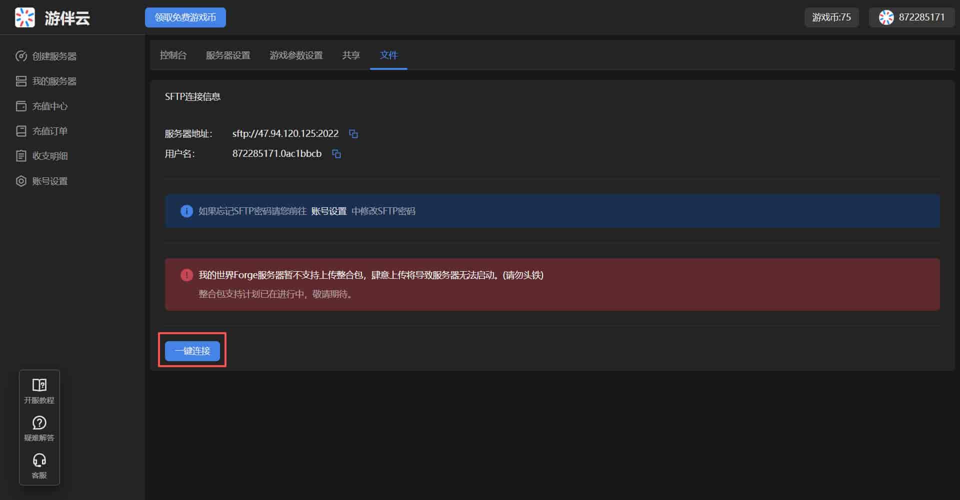 如果您需要手动连接 SFTP,SFTP 的密码与您的游伴云账号密码相同 :::
