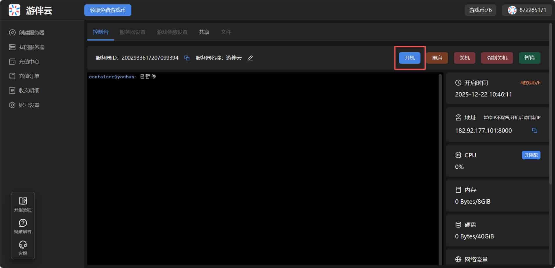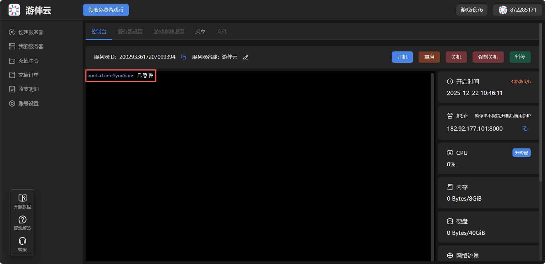 服务器更新需要手动关机暂停再开机,步骤如下: